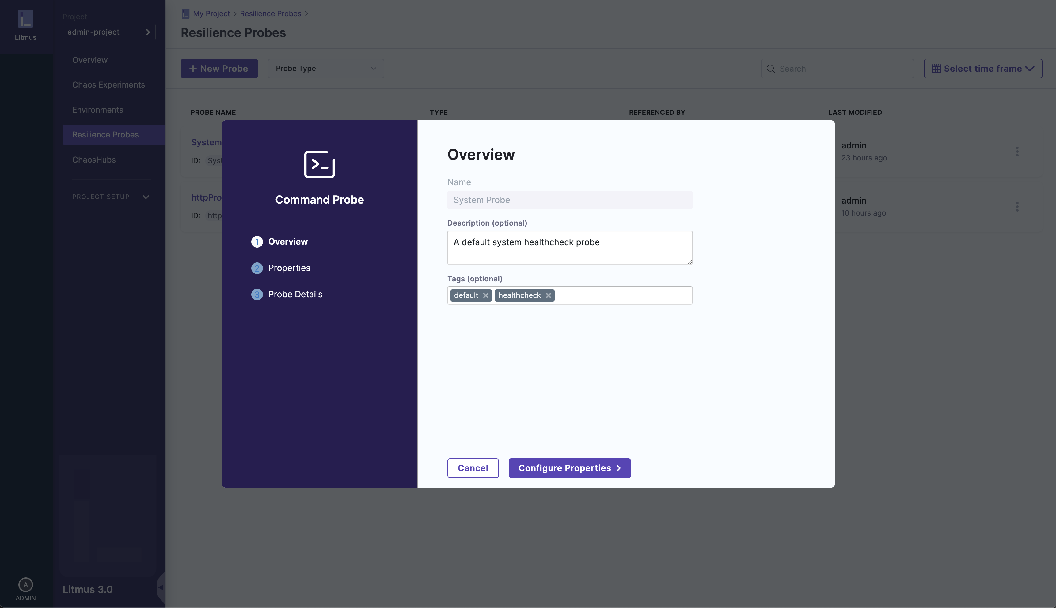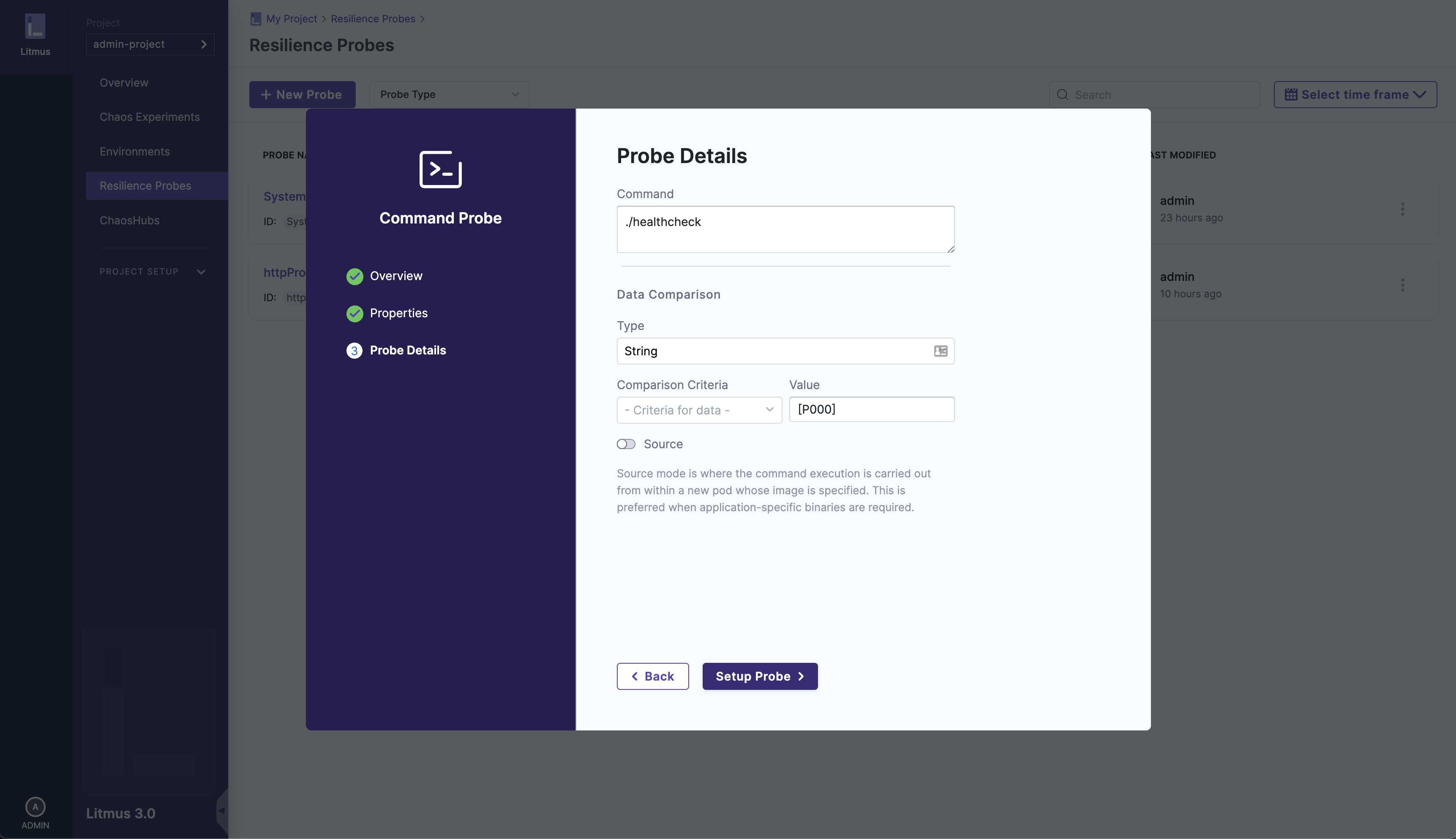 option, you'll see a modal pop-up where you will be able to go through all the steps of probe setup and edit the details on each step (Note: name is unique and cannot be edited):